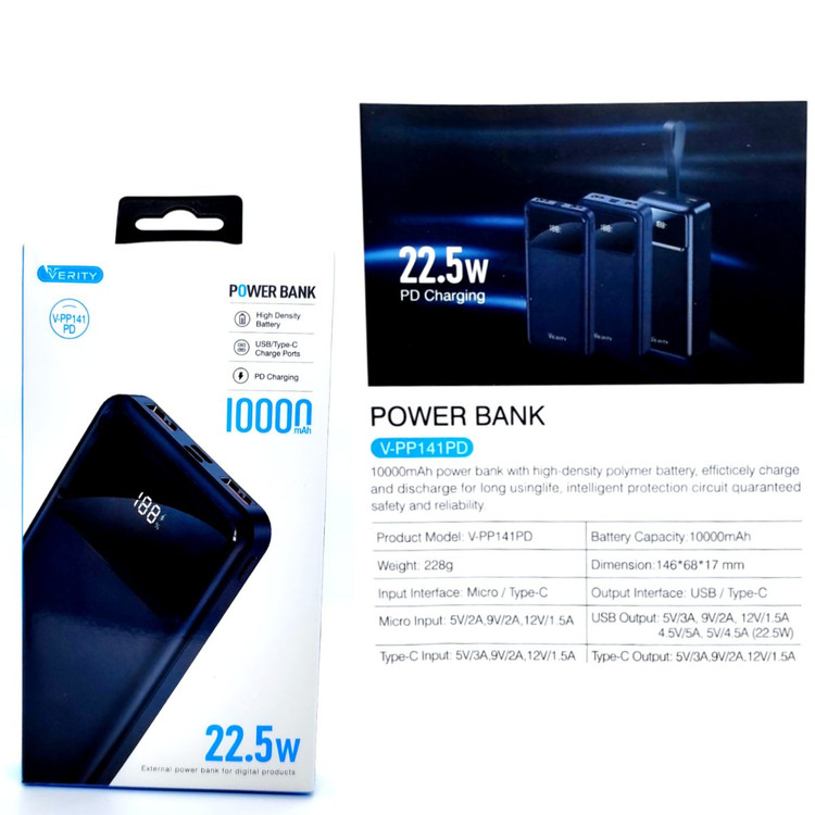 پاوربانک وریتی مدل V-PP۱۴۱PD با ظرفیت ۱۰۰۰۰ میلی آمپر ساعت و ۴ پورت متفاوت بسیار مناسب برای استفاده روزمره میباشد. مجهز به فناوری پیشرفته PD است و شارژ سریع را برای هر یک از دستگاه های دارای USB نوع C و میکرو شما فراهم می کند. پیشنهاد میکنیم آن را با دستگاههایی که از عملکرد Power Delivery پشتیبانی میکنند برای حداکثر عملکرد شارژ پورت تایپ سی جفت کنید. طراحی هوشمند: شارژر همراه وریتی دارای ۲ درگاه خروجی USB و یک پورت ورودی میکرو و یک درگاه ورودی و خروجی نوع C است. این می تواند ۳ دستگاه را به طور همزمان تحت شارژر معمولی شارژ کند . این محصول وزنی حدود 270 گرم دارد